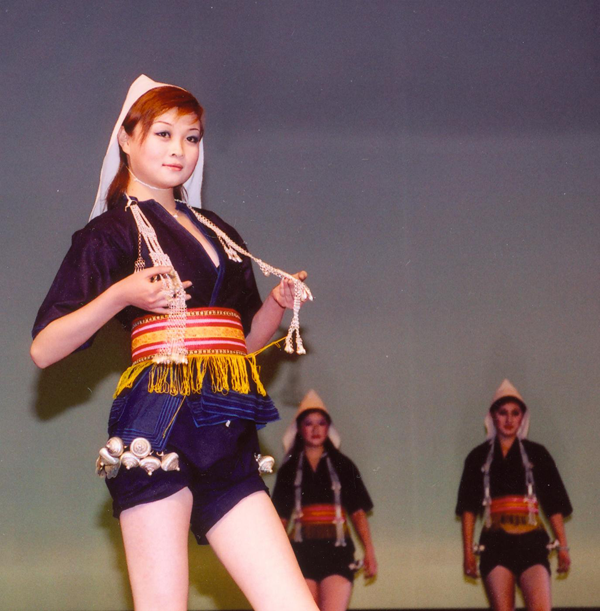 8.西摩洛支系。哈尼族西摩洛支系婦女服飾為上穿左大襟青藍(lán)色上衣,衣服長(zhǎng)及膝部,衣裙一體。腰帶是一根繡滿月亮花、狗牙花的藍(lán)布帶,或是銀腰帶。正面從胸部到腹部輟有數(shù)十甚至上百顆銀泡,衣角四周繡滿花草圖案;下穿窄管青藍(lán)長(zhǎng)褲,小腿纏綁腿布。