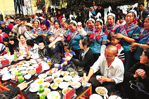 “中國(guó)紅河·元陽(yáng)2009年哈尼梯田文化旅游節(jié)”上,哈尼族群眾擺下360桌、近0.5公里長(zhǎng)的哈尼族長(zhǎng)街宴,用最隆重的禮儀和風(fēng)味美食,迎接來自海內(nèi)外的賓客。