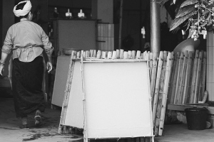 澆紙是在紙槽中進(jìn)行的,不但需要強(qiáng)勁的臂力,還需要相當(dāng)?shù)募?xì)心。在紙槽中舀水的時候,雙臂承受的重量不下10公斤,紙要澆得恰到好處,澆輕了紙就太薄,澆重了紙又太厚。太薄出不了好品相,太厚會增加成本。這是整個構(gòu)紙成品的關(guān)鍵,經(jīng)驗(yàn)老到的傣族老人,都不會在這道工序上馬虎。一雙手游走在澆紙槽,或輕輕拍打,或慢慢游弋,絮狀的纖維時而附著在手上,時而又歡呼雀躍地散開,頑皮得有點(diǎn)像芒團(tuán)村水塘邊遇上的那些孩子。憑感覺均勻了,老人這才輕輕將澆紙盤脫離水面,一眨眼功夫,一張構(gòu)紙便在盤上現(xiàn)出端倪。接下來的事就交給陽光了,如果雨季來臨,構(gòu)紙就停止生產(chǎn)。所以說,芒團(tuán)構(gòu)紙常常浸漬著一種陽光的味道。