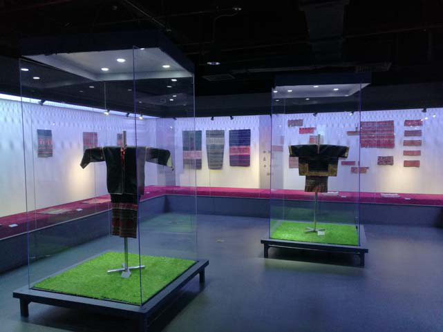 展覽共分為四個單元:第一單元“一體多元——黎族五大方言區(qū)的服飾”,整體展現(xiàn)黎族聚居的地理環(huán)境、服飾的一般性特點和多樣性。第二單“元古風猶存——黎族服飾的材質(zhì)和形制”,通過具有代表性的實物如樹皮衣、藤甲衣、麻質(zhì)服裝、棉質(zhì)服裝、貫頭衣、高領右衽衫、“超短裙”等來展現(xiàn)中國古代服飾的遺風。第三單元“神秘空間——黎族服飾的圖案與色彩”,這些圖案是什么?它們有什么含義?有些我們知道,有些連織繡筒裙的本人都不知道,這些神秘圖案給人提供了無限想象的空間。第四單元“管中窺豹——黎族服飾的織造工具、織造技術及織品”,黎族在棉紡織史上的領先地位已被學術界所承認,那么就從現(xiàn)存的一些工具如距織腰機、紡車、織錦布料、傳說的龍被和配飾品中去感受那曾經(jīng)的輝煌。