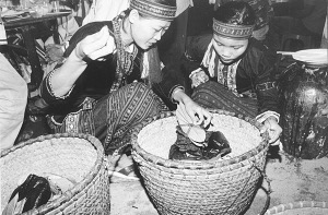 按照黎家人的規(guī)矩,“提親”是由男方家人請(qǐng)族內(nèi)的一位親嫂嫂當(dāng)媒人,帶著檳榔、簍葉、煙絲到女方家。如女方本人及家人樂(lè)意接受禮品,說(shuō)明親事已定下來(lái)了。