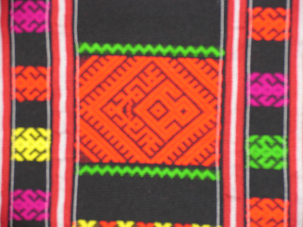 黎錦花紋圖案豐富多彩,多達(dá)百余種。較有代表性的圖案有人物類圖案、動物類圖案、植物類圖案、天體類圖案、器物類圖案、文字類圖案。其中,“人物類圖案”是黎錦的基本核心、中心圖案,它在各種織錦中永遠(yuǎn)居于中心位置,形成中心紋飾,其他圖案可根據(jù)需要,或放在它的周邊,或放在它的第三、第四等位上。人物類圖案有單個的,也有多個組合的,有全身的,也有半身和頭像的;同時也有復(fù)合圖的。復(fù)合圖像上,有三重人物圖像嵌套,大套中,中套小,形成復(fù)合效果,構(gòu)圖復(fù)雜,工藝精湛。人物類圖案即祖先紋或鬼紋,黎族民間管這類紋樣叫做“剖”、“登”,即“祖先”或“鬼”的意思。黎錦中的人物紋樣的定位,反映了黎族人的濃厚的祖先崇拜意識。