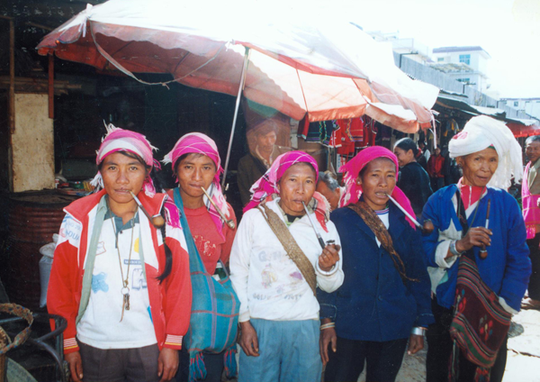 而婦女們的裝束特點(diǎn)分明與眾不同。最突出的是頭戴寬約3公分左右的銀箍,留長(zhǎng)發(fā);身著靛青色無(wú)領(lǐng)大襟右衽及橫條花筒裙。腰系紅布寬腰帶和數(shù)十根細(xì)藤圈。耳掛垂肩圓形大耳環(huán),頸戴銀質(zhì)大項(xiàng)圈,細(xì)項(xiàng)鏈。上了年紀(jì)的人,喜歡戴長(zhǎng)約五公分傘狀大耳筒,筒頂還刻有各種花紋。有的婦女在耳筒內(nèi)插上香花香草,有的放上人民幣,出門趕集,隨用隨取,很是便利(上下兩圖由劉軍供圖)。