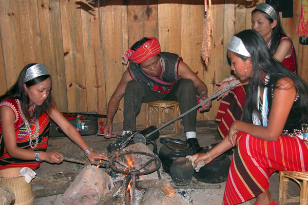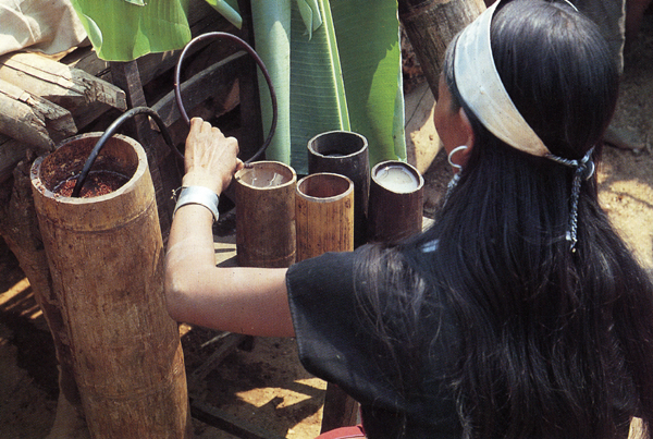 佤族普遍喜飲酒,喝苦茶。所飲用的酒都是自家釀制的“泡水酒”。常飲泡水酒不但于身體無害,反而有益健康。飲水酒成為佤族日常生活中主要的嗜好之一。喝酒時必須要請親友來家中共飲,主人給客人敬酒有一套規(guī)矩:必須一一敬酒。敬酒時,雙手捧竹酒筒,走到客人面前,弓身把酒筒從自己胸前按下再向上舉到客人嘴邊,主人喝一口,最后敬給客人喝干。如此一一敬酒,直至敬完所有在場的人,漏敬一個,都會被認(rèn)為是不合“阿佤理”的。敬酒時,第一個被敬酒的人,通常是在場的客人中最被尊重的人。他接過酒后,先要用右手沾出幾滴,滴在地上,并口念祝福的語言,表示敬主人的祖先(圖為用竹筒制水酒,劉軍攝)。