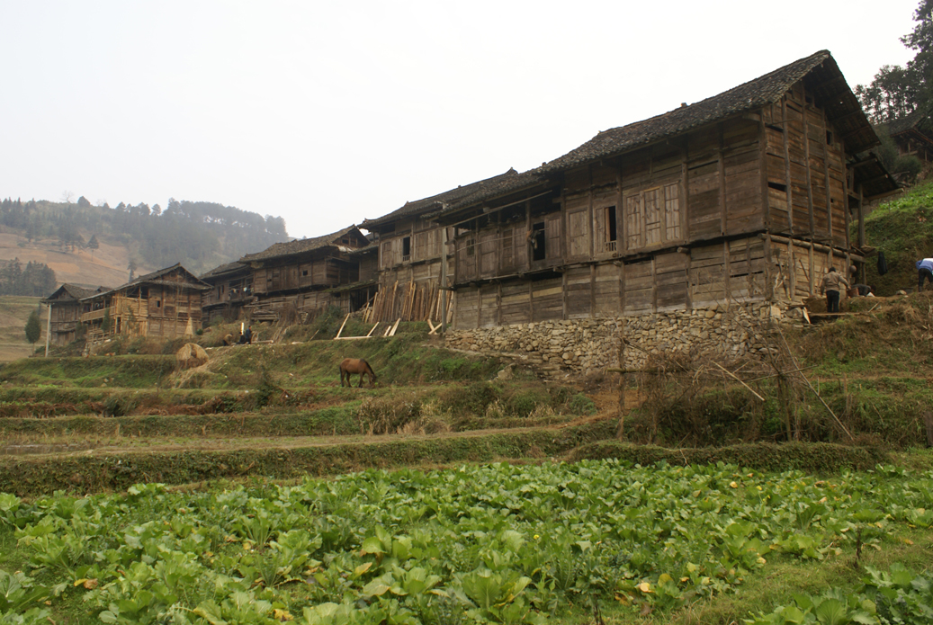 建筑藝術(shù)水族居住區(qū)處于亞熱帶,多雨潮濕,加之樹林茂密,豺狼虎豹野豬經(jīng)常出沒其間。水族居住“干欄”住宅,正可避免地面潮濕和野獸的侵害。“干欄”建筑是水族先民和南方民族智慧的結(jié)晶。水族聚居區(qū)大多是“聚族而居”,同血緣村寨毗連。散居、雜居地區(qū)這種狀況不大明顯。村寨多依山傍水,四周多修竹古樹,寨內(nèi)村腳多魚塘,房頭屋后,地角籬邊喜植果木。房屋多用杉、松建造,用瓦片或杉木皮覆蓋。整棟房屋建筑時不用一顆鐵釘,但十分牢固。