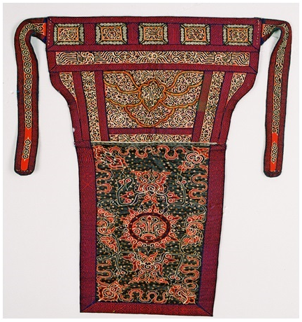 正因馬尾繡的工藝獨(dú)特,蘊(yùn)含著豐富的文化內(nèi)涵,2006年水族馬尾繡入選第一批國(guó)家級(jí)非物質(zhì)文化遺產(chǎn)名錄。而馬尾繡背兒帶更是將水族馬尾繡的藝術(shù)價(jià)值體現(xiàn)得淋漓盡致。民族文化宮博物館所藏的這件馬尾繡背兒帶,刺繡精美,展現(xiàn)了水族婦女?huà)故斓拇汤C技藝,是研究水族民俗、民風(fēng)、圖騰崇拜等民族文化的珍貴藝術(shù)資料。