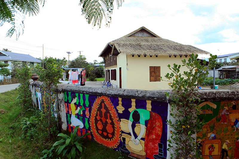 吞也指著家里客廳墻上的畫對我說:“畫中描繪的是我記憶中的故鄉(xiāng),一些古老的生活環(huán)境和生產(chǎn)方式,我想將這些逝去的生活記錄下來。”墻上掛著的不僅有吞也的畫作,還有一些瑞麗其他農民畫師、畫家們的作品。2011年,在文化惠民政策和鄉(xiāng)村旅游開發(fā)的帶動下,瑞麗市在喊沙寨設立了農民畫展室,目的是給農民畫營造一個原生態(tài)的展示環(huán)境。