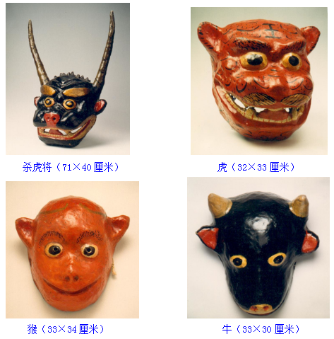 “殺虎將”反映的是當?shù)匾暈樯酵鯛數(shù)臍⒒槊癯?,降伏老虎的?nèi)容。面具角色有牛、虎、猴、殺虎將。牛象征農(nóng)民,代表善,虎和猴象征禍害。表演牛和虎、猴激烈打斗,當牛被打敗倒地時,殺虎將持劍上場,打殺格斗等場面。此時場外觀眾上場助戰(zhàn),直至將虎降服,整個場面熱烈緊張。