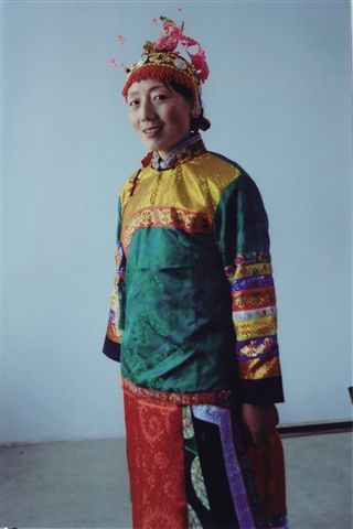 女子結(jié)婚或在節(jié)日期間的穿戴更為別致,身穿以綢緞縫制的兩袖口寬的繡花褂子,袖口鑲有七道或九道花邊,花邊上繡有各種花卉圖案,做工精細,鮮亮多彩。頭戴鳳冠,土族語叫“首帕冠”,鑲著瑪瑙和珊瑚,前沿密墜細小的珍珠穗子,中間是細銀絲制成的鳳凰。戴鳳冠時還需要綴假發(fā)誓,并用長簪加固。佩戴這種頭飾,土族語叫“素不都腦達”(即索卡斗?扭達爾之音轉(zhuǎn))。