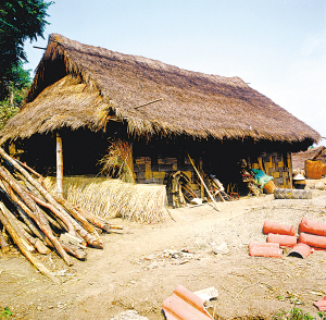 臨滄地區(qū)的耿馬縣芒洪鄉(xiāng)也是布朗族的聚居區(qū)。房屋以草頂居多,也有蓋竹瓦的。三開間居多,門在正中,左邊是火塘,是就餐待客和睡覺的地方,右邊放糧食雜物。房屋為木柱結(jié)構(gòu),縱向框架。大柱立于兩山墻中間,柱腳深埋地下,柱高依屋脊高度而定,柱頂以天然枝杈承托脊檁。以同樣的方法在四角各立頂端帶枝杈的柱子,柱高以屋檐的高度而定,承托邊檁。這樣6根木柱、3根檁木構(gòu)成了主要承重的縱向框架,也形成了雙斜面屋頂。在大柱間密栽小柱,小柱間再橫向綁扎竹片,從地面到柱頂形成密密麻麻的小方格子,這就是墻壁的骨架。然后把和了黃泥漿的長(zhǎng)草把一綹綹、均勻地掛到竹片上,將里外抹平,干后就成了“掛”著的草泥墻。