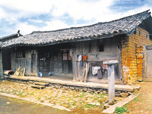 廚房大都在左間,地中間橫砌土臺(tái)鍋灶,上面是兩口大鐵鍋。靠后墻是炊具、餐具,前面是石碓,平時(shí)搗豬飼料,節(jié)日搗粑粑,用石碓搗的辣椒面也格外好吃。右間大都是家長(zhǎng)的居室,只放木床。兩側(cè)廂房與主房分離,木板梯上下。一側(cè)下層是豬圈、牛欄,上邊存干草;另一側(cè)下面堆放糧食、燒柴、摩托車(chē),上層是未婚子女的臥室,有廊道、腰欄。院落小的,在主房對(duì)面設(shè)牛欄,砌土坯墻圍成獨(dú)立的合院。