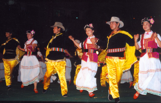 普米族的民間娛樂舞蹈,普遍具有歌、舞、樂三位一體的特點(diǎn)。舞蹈形式正如普米族民歌所唱的:“如金線把珍珠穿成一串,手拉手跳成十五的月亮。”娛樂舞蹈全是手拉手轉(zhuǎn)圓圈的舞蹈形式。人們挽手而跳,伴以高亢洪亮、情感激越的唱詞。特別是普米族婦女雪白的長裙隨舞步輕盈飄旋,似白鷺翻飛,正如《打跳歌》中所唱的:“笛聲不停莫歇腳,舞場上沒有陡巖子,腳底板下沒有刺,跳它個地動山也搖?!痹谙矐c的集會之夜,歡快的娛樂性舞蹈,往往一跳就是通宵達(dá)旦。跳鍋莊是普米族傳統(tǒng)的舞跳形式,這種舞蹈不受時間空間的限制,只要一支竹笛或葫蘆笙,有一塊空地即可進(jìn)行,少則三五人,多則數(shù)百人。一般總是在傍晚,在院內(nèi)或場壩上舉行。跳舞時,總要在中間燃起一堆火,與室內(nèi)的鍋莊相似,所以稱之為鍋莊舞。鍋樁內(nèi)容很豐富,從古代的游牧、狩獵、紡織到今天的趕街、慶豐收、烤酒等都有反映。流行的曲調(diào)有《放單調(diào)》《出山》《獅子舞》等等。現(xiàn)在,鍋莊舞已發(fā)展成為集唱詞、曲調(diào)、舞蹈、音樂于一體的綜合性歌舞藝術(shù)。