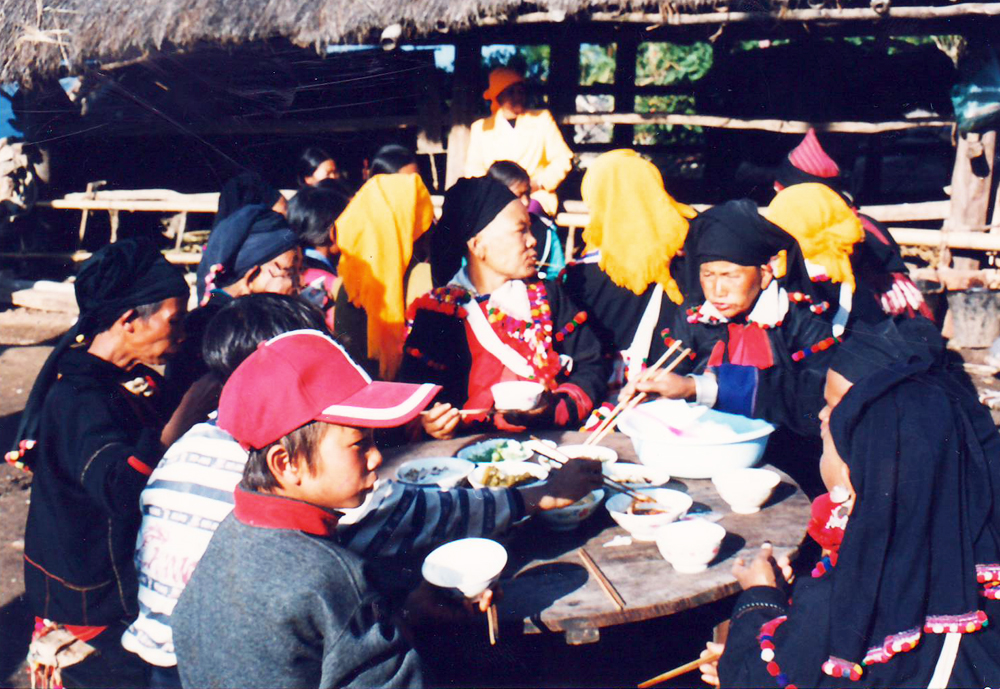 在舉行婚禮的三天內(nèi),全村寨的人們都要到新郎新娘家做客,自己家里則無需生火做飯。新郎新娘的親戚朋友和小伙伴們都會(huì)來幫助料理結(jié)婚的有關(guān)事務(wù),男女兩方家里都忙忙碌碌,喜氣洋洋。頭一天晚上,男女雙方家里賓客盈門,一派熱烈的節(jié)日景象。新郎的父母拿出香醇的米酒,請賓客開懷暢飲,新郎則跟在后面,給每一桌客人磕頭作揖,并接受賓客的祝賀。當(dāng)天晚上,新郎新娘分別在各自的家里挎著筒帕,里面裝著草煙、蘆子、沙基和石灰盒,把同村寨的姑娘、小伙子請到客房里,請他們抽草煙、嚼檳榔。