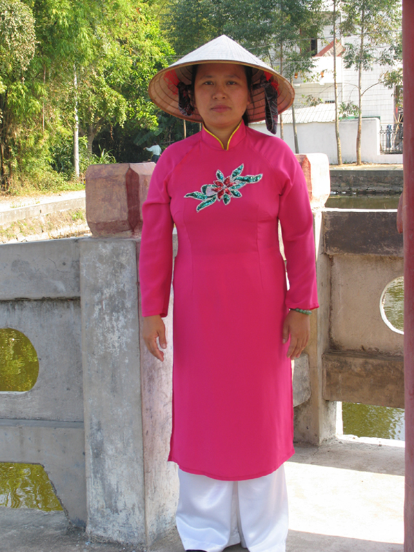 京族婦女的上衣與男性相反,是無領(lǐng)、開襟、有三粒紐扣的短上衣。婦女的衣衫較短,衫角的長度只到人的腰部,沒有蓋過臀部,所以有“長不及臀”的講法。婦女的短上衣衣袖較窄,和男性的沒有差別,衣袖的寬度剛好能穿過手臂。婦女上衣袒胸之處遮以一塊繡有圖案的菱形小布,年輕人多為紅色,中年人多為淺紅或米黃色,老年人通常為白色或藍(lán)色,這種小布通常稱為“遮胸”,是婦女常用的裝飾品之一。其褲子寬闊度與男性無異。京族婦女傳統(tǒng)服飾采用的顏色有年齡之分。青年、中年女性穿的上衣通常選用白、藏青或草綠等顏色,褲子多選用黑色、褐色;老年婦女衣褲則多選用黑色、棕色等。在衣服用料選擇上,則視貧富而定。大部分家境一般的京族人用的是自己生產(chǎn)的粗糙棉麻布,而富裕的人家選用蠶絲品或者貴重的綾羅綢緞為衣服料子。