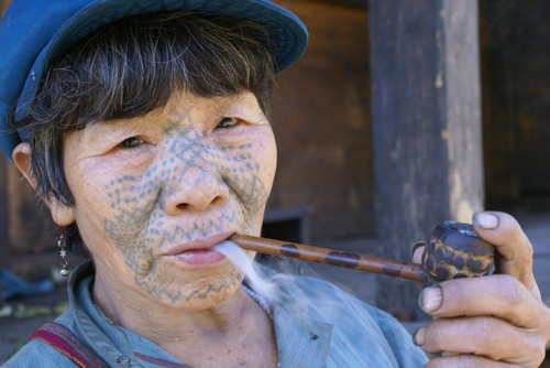 至于紋面原因,紋面女們有多種說法,有的說是為了好看,有的說是為了死后與靈魂相認(rèn),有的說是為了不被人搶去為奴,有的說是為分辨男女。有的為了死后能帶走生前的東西。紋面是一件極痛苦的事,一般是用一根荊棘刺出圖案,用西南樺制成的染料著色。臉上血管、神經(jīng)豐富,要紅腫、劇痛3-5天,所紋圖案終生不退。