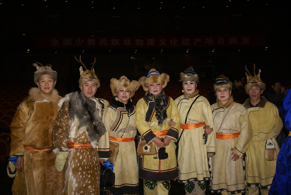 鄂倫春族的傳統(tǒng)服裝以袍式為主,冬季穿“蘇恩”。“蘇恩”是用冬季絨毛狍皮縫制的右任長(zhǎng)袍,小立領(lǐng),襟邊、下擺和袖口用黑色皮鑲嵌云卷花紋等邊飾,女袍還要作環(huán)肩裝飾。為便于奔跑和騎馬,“蘇恩”都有開(kāi)衩,衩口裝飾圖案豐富多彩。夏天穿用夏季沙毛狍皮制作的短袍或坎肩,布匹傳入以后穿布袍。 男子下身穿狍皮短褲,褲腿過(guò)膝,樣式如老式免襠褲,后來(lái)改穿長(zhǎng)褲。出獵時(shí)褲子上面還要穿套褲。套褲無(wú)襠,呈筒狀,上角釘有皮條,系在腰帶上。一般用夏季的狍皮縫制,因?yàn)橄募镜尼笃ぐ搴衲湍ィ灿杏寐蛊たp制的。婦女的褲子樣式比較獨(dú)特,長(zhǎng)至腳面,比男褲瘦些,腰兩側(cè)有開(kāi)衩,前面有兜肚,兜肚頂端釘皮條,系在脖子上。這樣的褲子,既保暖又便于騎馬,可以護(hù)住前心,又起到了乳罩的作用。講究的人還在褲子兩側(cè)和褲腳處繡上花邊圖案。