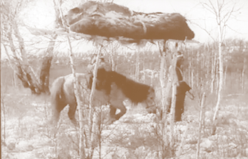 鄂倫春族的傳統(tǒng)葬法主要有風葬、土葬、火葬和水葬。風葬又稱天葬或樹葬,其葬法是:選擇四棵成對角的大樹,在距地面1米多高的地方截斷,上面搭木架或借助樹杈放棺材。成年人風葬后通常還要進行二次葬,即將其遺骨再土葬到氏族墓地里。游獵時期由于條件所限棺材非常簡陋,最初風葬是借助樹杈搭木架,把死者安放在木架之上,再用樹枝覆蓋。土葬是挖一個長方形土坑,四壁用木桿壘起來,下面鋪草,上面蓋樺皮再埋土。后來人們用樺皮縫制或用柳樹條編制棺材,也有將空心樹從中間劈開,把尸體扣在中間的。最好的是“木刻楞”棺材,制作方式跟建造“木刻楞”房差不多,把截成長短適度的圓木兩頭砍成凸、凹形,使其相互咬合形成框架,底和蓋是用繩子或柳條把一些圓木排列著捆綁在兩根橫木上。這種“木刻楞”棺材堅固,不易被野獸破壞,多用于風葬。