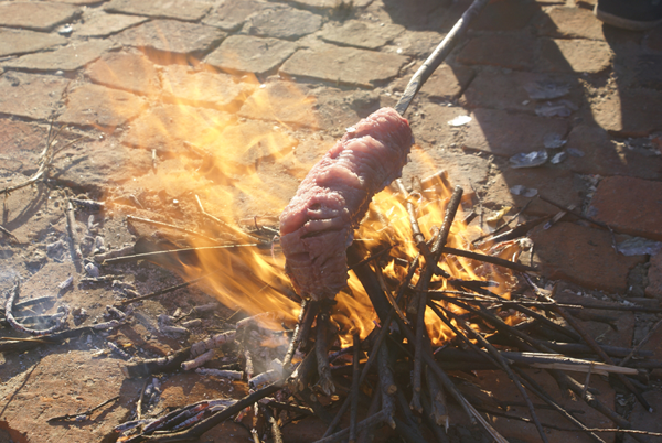 曬肉干,赫哲語叫“胡烈克特”。通常用鹿、狍、野豬、熊等獸肉制作肉干。把動物的皮剝?nèi)ヒ院螅瑢⑺闹屠锛共课坏娜馊∠聛砬谐尚K,用木棍串上烤熟,然后切成小塊,曬干后儲存起來。曬肉干可以當干糧吃,也可以用開水浸泡后燉著吃。