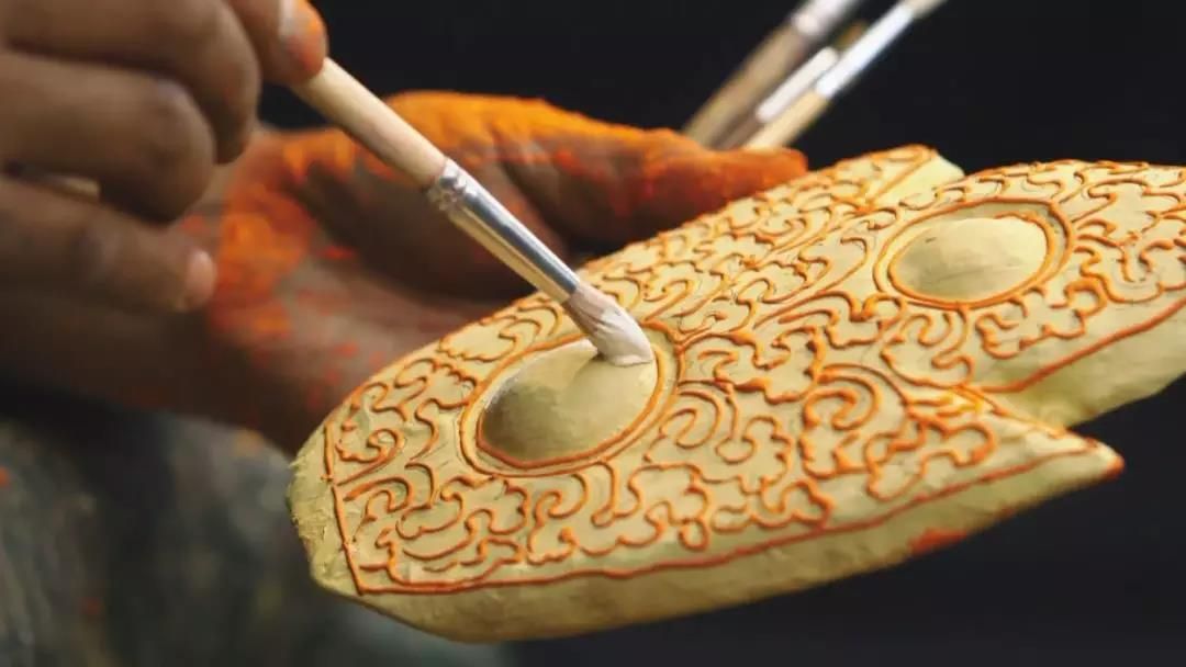 在等待膠布面具晾干的時(shí)候,扎西去到了兒子練習(xí)跳舞的地方,在外面遠(yuǎn)遠(yuǎn)的看著兒子練舞。原本希望兒子繼承他這手藝的心思,在看到兒子真心喜歡藏舞后,也被漸漸放了下來?;氐郊抑?,膠布面具已經(jīng)干透,開始了制作面具中最重要的一環(huán):上顏色。隨后上頭發(fā)、簪子等小零件,一個(gè)薩迦面具終于制作完成。