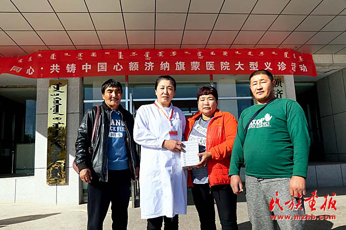 在額濟(jì)納旗蒙醫(yī)醫(yī)院開(kāi)展的義診活動(dòng)上,專(zhuān)家們向蒙古國(guó)患者贈(zèng)藥。