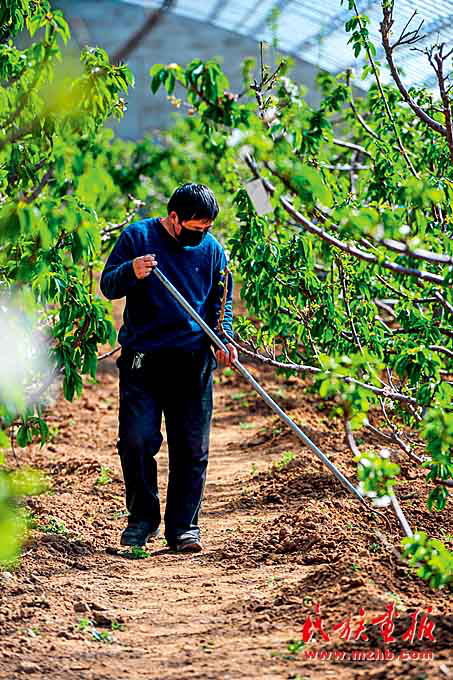 2020年3月,洪浩爾敖包村的貧困戶李玉山在大棚里給櫻桃樹(shù)鋤草。(新華社 供圖)