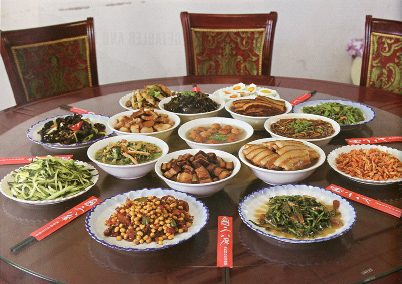 關(guān)于二八席的由來(lái),在七道梁村是這樣流傳的:當(dāng)年,薩爾滸大捷后,努爾哈赤要求八旗各拿出一盤和一碗本旗最好的吃食,以供設(shè)宴擺席之用。于是,八旗紛紛響應(yīng),八個(gè)盤、八個(gè)碗的特色菜肴湊在一起,便有了二八席。