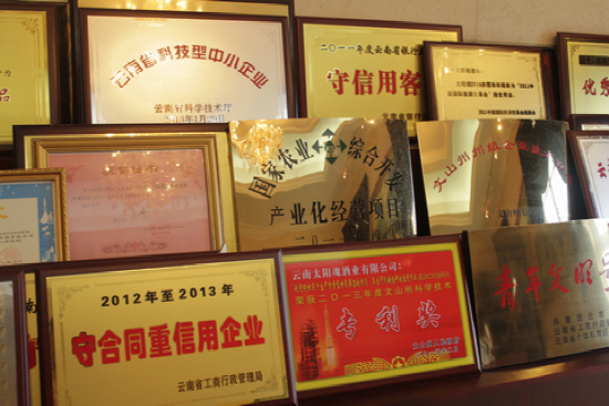 十幾年的風(fēng)雨兼程,太陽(yáng)魂酒業(yè)有限公司榮膺多項(xiàng)殊榮,先后獲得“云南省農(nóng)業(yè)產(chǎn)業(yè)化省級(jí)龍頭企業(yè)”、“云南省農(nóng)產(chǎn)品加工重點(diǎn)企業(yè)”、“全國(guó)休閑農(nóng)業(yè)與鄉(xiāng)村旅游示范點(diǎn)”、“云南省著名商標(biāo)”、“云南省省級(jí)企業(yè)技術(shù)中心”、“2009中國(guó)(昆明)酒業(yè)發(fā)展高峰論壇暨新中國(guó)60周年云南酒業(yè)十大功勛品牌”及“云南酒類消費(fèi)市場(chǎng)十大最具成長(zhǎng)性品牌”、“云南省接待用酒”等榮譽(yù)稱號(hào)。已獲得QS認(rèn)證、ISO9001認(rèn)證,HACCP認(rèn)證等高標(biāo)準(zhǔn)企業(yè)資格證書。產(chǎn)品質(zhì)量達(dá)到國(guó)內(nèi)先進(jìn)水平,釀制的“赤霞珠”葡萄酒獲2006年亞洲葡萄酒質(zhì)量大賽金獎(jiǎng)、北京國(guó)際葡萄酒暨烈酒挑戰(zhàn)賽銅獎(jiǎng)和第八屆中國(guó)國(guó)際葡萄酒及烈酒評(píng)酒會(huì)上榮獲銀獎(jiǎng),梅里圣地冰酒榮獲2006年亞洲葡萄酒大賽銀獎(jiǎng)、2012年亞洲質(zhì)量大賽金獎(jiǎng)及領(lǐng)袖產(chǎn)區(qū)代表產(chǎn)品。朗姆酒2011年榮獲“2011中國(guó)(蓬萊)國(guó)際葡萄酒?烈酒品評(píng)賽”銀獎(jiǎng)。2011年國(guó)際釀酒師葡萄酒烈酒大賽中獲得銀獎(jiǎng),2012年獲得國(guó)際釀酒師葡萄酒烈酒大賽金獎(jiǎng)。2012年,公司釀造的赤霞珠產(chǎn)品被法國(guó)勃艮第大學(xué)葡萄酒學(xué)院指定為教學(xué)用酒。2013年7月,“梅里圣地赤霞珠冰酒”榮獲2013中國(guó)優(yōu)質(zhì)葡萄酒挑戰(zhàn)賽金獎(jiǎng)。同時(shí),公司位于德欽產(chǎn)區(qū)的干紅及冰酒已通過有機(jī)產(chǎn)品認(rèn)證。2014年“2012梅里冰酒”榮獲國(guó)際領(lǐng)袖產(chǎn)葡萄酒(中國(guó))質(zhì)量大賽優(yōu)質(zhì)獎(jiǎng),拍品價(jià)格1萬元。