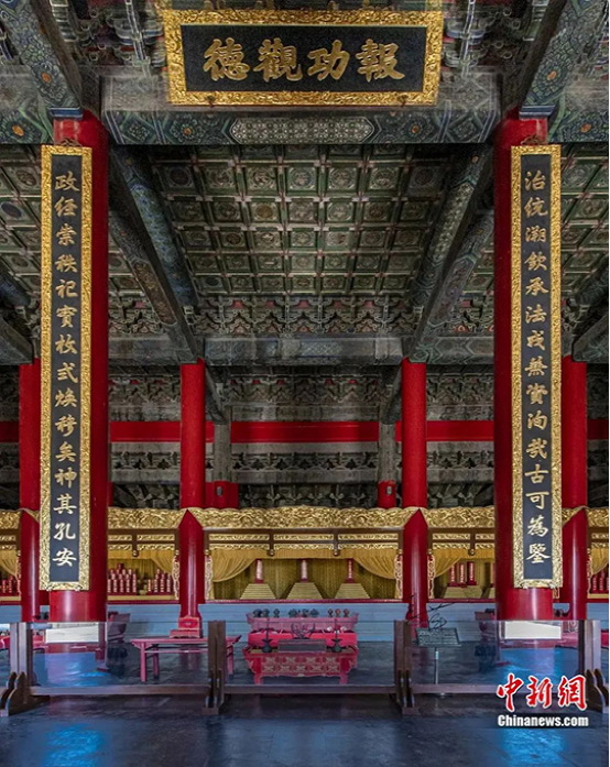 歷代帝王廟景德崇圣殿內景匾額與楹聯(lián)。(中新社發(fā) 許偉 供圖)
