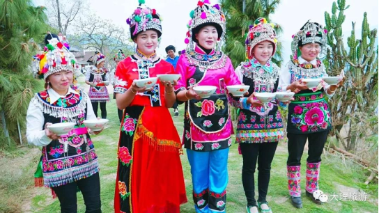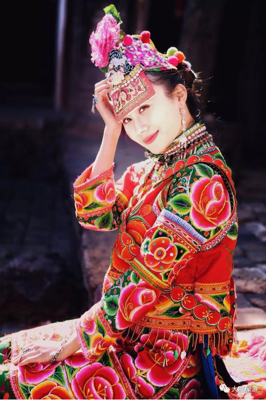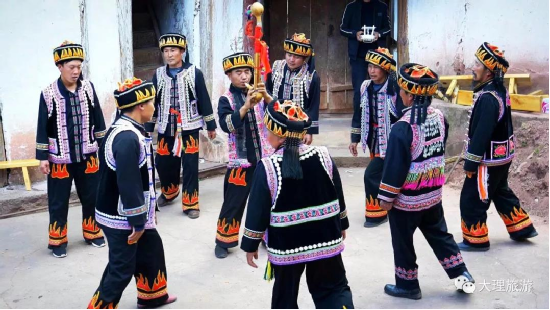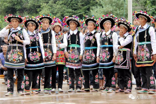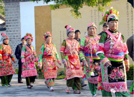 男子頭頂氈帽(又稱氈窩),穿大襟衣、大襠褲,赤足或穿草鞋,披羊皮,外出背皮袋(現(xiàn)已基本消失)。女子裹高包頭、額上飾銀桂花,衣為布襟,外套坎肩,腰系大圍腰,大圍腰左右下三邊繡五色花,為動植物圖案,足穿繡花鳳頭鞋,用本地產(chǎn)綠布條制褲子,不鎖腳邊,腰間背圓形白氈裹背,所穿服飾顏色鮮艷、質(zhì)地厚重,盡顯遠古南詔皇室服飾遺風(fēng)。