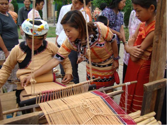 2010年上海世博會(huì)活動(dòng)周期間,一臺(tái)名為《記憶云南》的18項(xiàng)非物質(zhì)文化遺產(chǎn)展示成為最吸引眼球的亮點(diǎn)之一?;顒?dòng)現(xiàn)場(chǎng),18名云南非物質(zhì)文化遺產(chǎn)傳承人和民間藝人展示白族布扎、納西族東巴畫(huà)、傣族剪紙、傣族竹編、佤族織錦技藝等制作技藝。其間展示的佤族織錦技藝在民族文化風(fēng)情濃郁,文化底蘊(yùn)深厚的耿馬縣佤族村寨里流傳甚廣。在耿馬的佤族村寨里,婦女們一般都會(huì)紡線織布,佤族傳統(tǒng)服飾也多用自染自織的土布縫制。此地佤族傳統(tǒng)服飾按地域分為兩大類。一類是分布在耿馬鎮(zhèn)、四排山鄉(xiāng)的傳統(tǒng)服飾,以女性身著佤族紅色短衣筒裙、男子身著佤族黑衣寬褲為標(biāo)志;一類是分布在勐簡(jiǎn)鄉(xiāng)大寨村的“黃衣阿佤”服飾,以女性身著佤族黃衣筒裙、男子身著黃衣寬褲為標(biāo)志。佤族婦女所用的紡線有棉線、麻線兩種。棉主要是草棉,麻主要為苧麻和野生火麻,紡線采用內(nèi)地傳入的有紡錘的紡車。在耿馬鎮(zhèn)芒國(guó)村芒俄村民小組等佤族聚居村寨,筆者先后目睹了佤族織錦的全過(guò)程。只見(jiàn)紡織 中的佤族婦女一個(gè)個(gè)端坐在紡車前,凝神專注地操持著手中的活計(jì)。她們左手持麻,右手持紡錘,將紡錘放在大腿上一搓,紡錘轉(zhuǎn)動(dòng)起來(lái)后,把麻纖維慢慢從左手拉出并捻成線,紡好一截線便將它繞到小竹棍上。如此這般不停地左右穿梭,又不斷地再搓、再捻,紡出的布匹紋理細(xì)密、結(jié)實(shí)挺拔。耿馬四排山鄉(xiāng)織錦的佤族婦女,大多采用一套竹木制的很原始的腰機(jī),前后上下共有十七個(gè)零件。紡線時(shí),她們將線的一頭栓在婦女腰上,另一頭用木棍穿好,擱在織布處釘在地上的兩根木樁上。織時(shí)兩頭繃緊,將繞在木棍上的緯線穿到經(jīng)線的中間,然后用抒刀把線打緊。這種織法節(jié)奏雖然慢一些,但織出的布更加厚實(shí)緊繃,適用于紡織粗布和麻袋。在勐簡(jiǎn)鄉(xiāng)大寨村的穿“黃衣”的佤族婦女,用黃土、玉米粉、茶葉、小飯豆、欖樹(shù)皮等7種植物做原料浸染的黃色棉線織錦,使用的有竹木制腰機(jī)和紡錘紡車兩種??楀\時(shí),只見(jiàn)她們一邊捻線,一邊傳遞紡錘。不織時(shí),又把紡錘和抒刀拆下,依然卷起放好。來(lái)自耿馬鎮(zhèn)、四排山鄉(xiāng)、勐簡(jiǎn)鄉(xiāng)的佤族群眾介紹,中華人民共和國(guó)成立后,由于商店里賣的布料比佤族自織的布料更價(jià)廉物美,佤族人家自己紡織制作服飾的已經(jīng)不多,但是縫制麻布被和麻袋用的麻布,還是多數(shù)來(lái)源于自家紡織,尤其是佤族村寨婦女穿的裙子,也必須是自己織,不然會(huì)被人同族人恥笑為愚笨和懶惰。2009年以來(lái),每年5月中旬,耿馬都要舉辦佤族“青苗節(jié)”慶典活動(dòng)?;顒?dòng)期間,該縣不僅上演豐富多彩的文藝節(jié)目和民間體育比賽項(xiàng)目,還現(xiàn)場(chǎng)展示該縣獨(dú)具特色的佤族織錦技術(shù)??楀\展示中,來(lái)賓增長(zhǎng)了對(duì)佤族傳統(tǒng)手工技藝方面的知識(shí),不少圍觀群眾還饒有興趣地一邊詢問(wèn)織錦者,一邊親自動(dòng)手體驗(yàn)這項(xiàng)古老而傳統(tǒng)的紡織技藝。