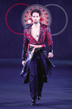 課題組將彝族銀飾經(jīng)典的浮雕圖案元素、彝族畢摩繪畫和文字元素、彝族服飾傳統(tǒng)紋樣圖案元素、彝族鸚嘴帽元素、朵洛荷舞蹈元素、察爾瓦流蘇元素等融入到作品中,沿用傳統(tǒng)民族服裝的色調(diào),并對圖案和造型進(jìn)行現(xiàn)代設(shè)計和審美的轉(zhuǎn)化與提升,傳統(tǒng)服飾與現(xiàn)代創(chuàng)新設(shè)計相結(jié)合,碰撞出了新的時尚美感。