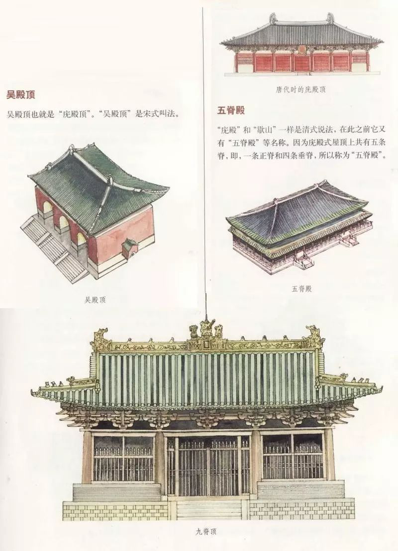 其中廡殿頂最早,約出現(xiàn)于先秦時(shí)期。在商代的甲骨文、周代銅器、漢畫像石與明器、北朝石窟中都有反映。據(jù)《周禮·考工記》載:“商人四阿重屋”,即早在商朝,已有四阿屋頂,但只是四坡水的茅草房而已。