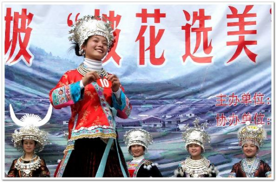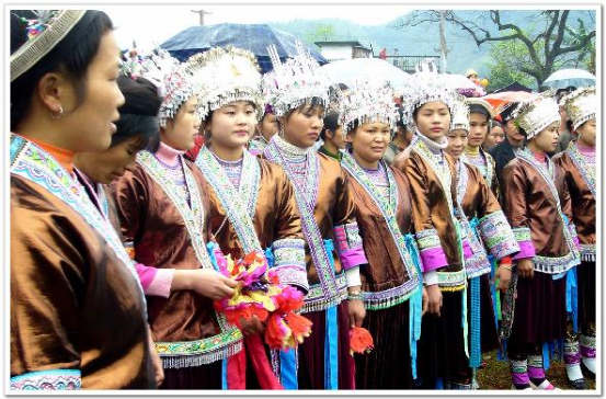 廣西融水縣的香粉古龍坡會于每年農(nóng)歷正月十六舉行,所以又名“十六”坡。這一天、來自外國朋友、各地的游客及當(dāng)?shù)胤綀A十里的苗哥苗妹,提蘆笙,提鳥籠、牽馬匹,打花傘……朝著十六坡趕來。正午時分,山梁上、村道間、河溪旁,出現(xiàn)了成列成隊穿紅戴綠的人群。遠(yuǎn)遠(yuǎn)望去,似一條彩帶在飄動。當(dāng)萬余人江集后,整個坡地就成了彩色的世界。