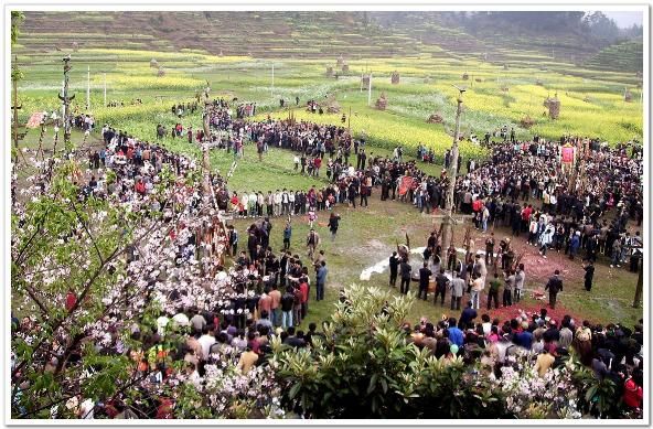節(jié)日當(dāng)天,一大清早,人們穿上節(jié)日的盛裝,翻山越嶺地從各條大路小路往坡會地匯集。山坡上、田垌里、公路邊到處擠滿了看熱鬧的人群。