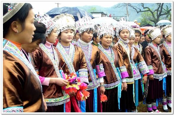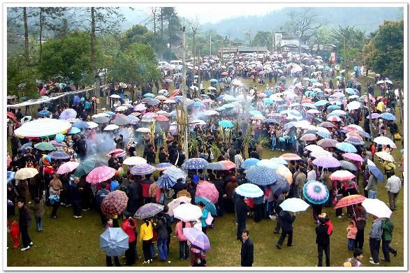 香粉古龍坡會(huì)于每年農(nóng)歷正月十六舉行,所以又名“十六”坡。這一天、來自外國朋友、各地的游客及當(dāng)?shù)胤綀A十里的苗哥苗妹,提蘆笙,提鳥籠、牽馬匹,打花傘……朝著十六坡趕來。正午時(shí)分,山梁上、村道間、河溪旁,出現(xiàn)了成列成隊(duì)穿紅戴綠的人群。遠(yuǎn)遠(yuǎn)望去,似一條彩帶在飄動(dòng)。當(dāng)萬余人匯集后,整個(gè)坡地就成了彩色的世界。