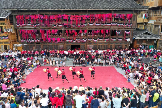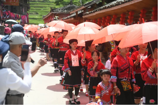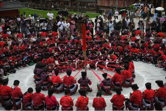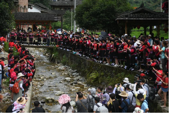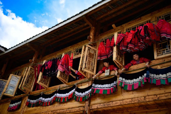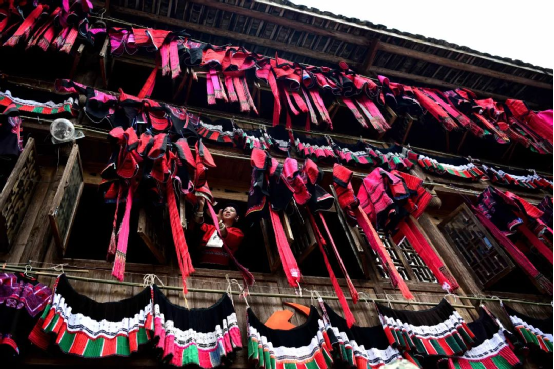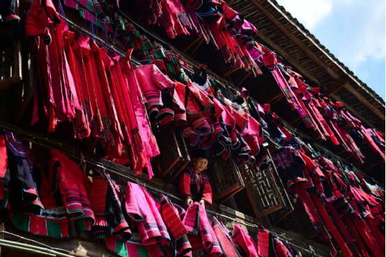 這一天,寨子里賓客盈門熱鬧異常,嫁出去的女兒和在外寨入贅的兒子都要挑著鴨子、酒和禮品,背著小孩回家吃團(tuán)圓飯,家家戶戶包粽子過大節(jié)。紅瑤姑娘和嫂子們,紛紛推開窗戶,拿出民族盛裝一件件掛在窗外晾曬,整個(gè)寨子掛滿了紅衣服,顯得格外鮮艷奪目。