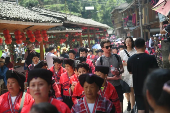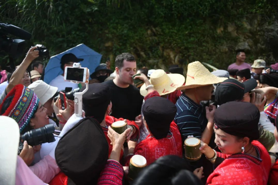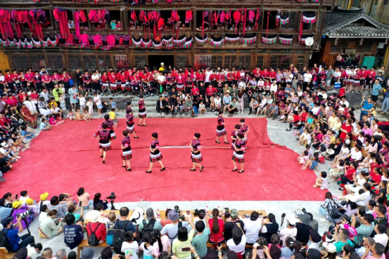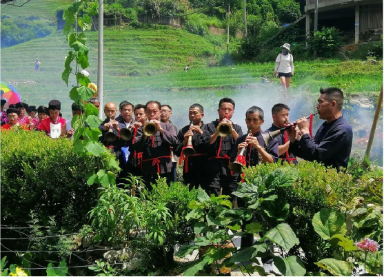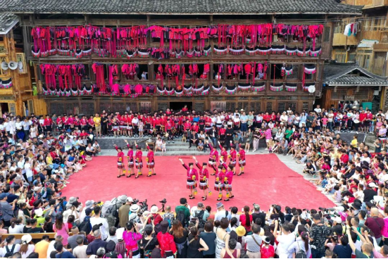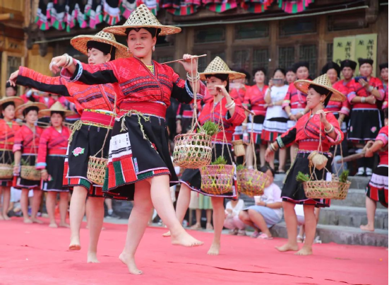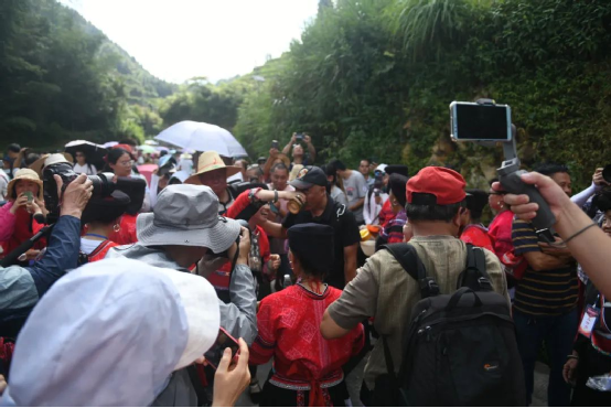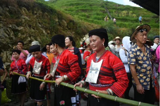 曬衣節(jié)當(dāng)天還進(jìn)行了嗩吶鑼鼓迎賓、瑤嫂長(zhǎng)發(fā)梳妝展示、“抬金狗”送祝福、紅瑤服飾加工展示、紅瑤集體婚禮等活動(dòng),豐富多彩的民俗文化、濃郁的民族風(fēng)情,讓各地游客流連忘返。