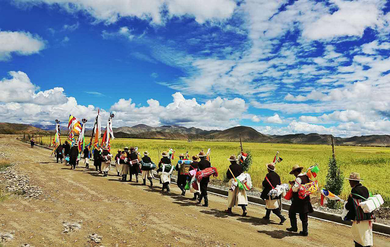 節(jié)日的第一天早晨,當(dāng)陽光撒滿金黃麥田的時候,農(nóng)民們手持麥穗圍著農(nóng)田轉(zhuǎn)圈游行,最前邊是由喇嘛和老年農(nóng)民組成的儀仗隊,高舉佛像,背著經(jīng)書,吹著佛號,感謝上天給人們帶來了風(fēng)調(diào)雨順的好年成。轉(zhuǎn)完麥田以后,照例要在廣場上舉行群眾性文娛體育活動,其中有藏戲、歌舞、跑馬、射箭、拔河等,十分熱鬧。這天,家家戶戶都要準(zhǔn)備充足的酒食,穿上最漂亮的衣服,或者在廣場四周的草場上野餐,或者在村子里邀集親朋好友宴飲。青年男女則喜歡在晚上圍著篝火跳舞,對唱情歌,直到深夜。