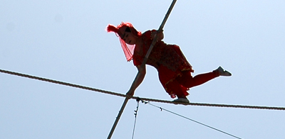 “達瓦孜”既是少數(shù)民族傳統(tǒng)體育運動表演項目,也是節(jié)日里娛樂活動,它有雜技和體育的雙重特點。“達瓦孜”高空走繩表演十分壯觀,在空曠的場地上,中間聳立三十多米高的立桿,頂處扎一牌樓上掛彩旗。牌樓橫桿兩端有表演用的吊杠和吊環(huán)。表演技能的繩索長八十多米。表演者手持長約6米的平衡桿,不系保險帶,在繩索上作前后走動、盤腿端坐、蒙眼行走,甚至腳踩碟子、飛身跳躍等一系列驚心動魄的動作。經(jīng)過不斷實踐和發(fā)展,“達瓦孜”表演技巧有了新突破,在濃郁民族風(fēng)味維吾爾族民間樂曲伴奏中,表演者輕松自如地在、高空繩索上踏著節(jié)拍跳舞歌唱,并且敏捷地變換著高難動作。