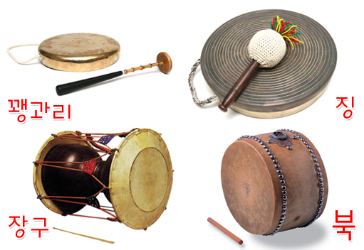 “四物樂(lè)”,朝鮮語(yǔ)為????。四物樂(lè)是由韓國(guó)著名民俗家沈雨晟先生命名的,20世紀(jì)90年代傳入我國(guó)吉林延邊朝鮮族自治州?!八奈飿?lè)”由小鑼?zhuān)???)、鑼(?)、長(zhǎng)鼓(??)、圓鼓(?)四種樂(lè)器演奏音樂(lè),并且由此音樂(lè)來(lái)做游戲。每種樂(lè)器都是以大自然的聲音來(lái)形成的。小鑼象征風(fēng),長(zhǎng)鼓象征雨,圓鼓象征雷,鑼象征電。
