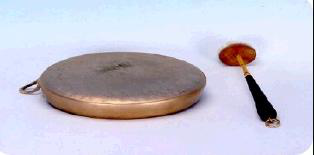 與小鑼相似但比小鑼要大,通常為面徑70CM,邊圈高10CM,邊穿小孔,用繩索固定。演奏時(shí),左手提繩,右手拿錘演奏;盤(pán)坐演奏時(shí)大鑼?xiě)覓煸谀炯苌?,可以用手?lái)控制音色,其聲音洪亮、粗獷。