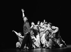 引子部分,板兒聲響,一個調(diào)皮的男孩偷跑出來聽書,他穿越人墻等待好戲開場。此時,說書人突然開講,吸引越來越多的“觀眾”(舞者)紛紛上前,仔細(xì)聆聽接下來發(fā)生的離奇故事。第一段舞蹈以群舞的形式表現(xiàn)人潮逐漸聚集的場景,通過“側(cè)耳聽”和“左右看”這兩個動作,反映出“觀眾”對于山東快書的好奇之心。