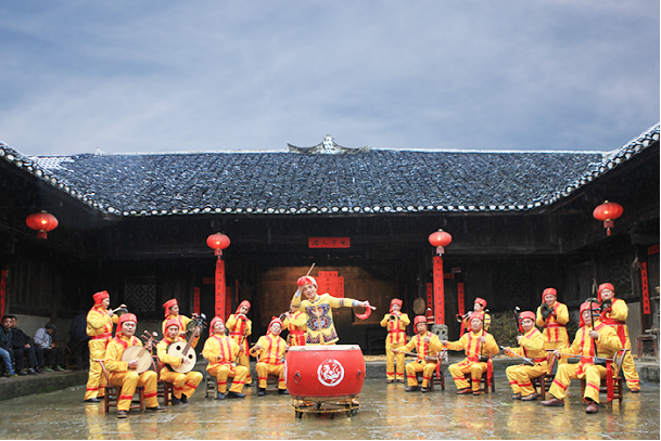 民俗性。建始絲弦鑼鼓產(chǎn)生及發(fā)展是以廣泛的民俗活動為載體的。因為獨特的演出形式,其樂隊配置可大可小,小到5人的基本配置,大到幾十人的鑼鼓喧天。既可登大雅之堂,又可進入千家萬戶;既可坐著表演,又可在行進中演出。它既是表演藝術(shù),又可以和紅白喜事渾然一體,成為紅白喜事活動主體不可分割的部分,所以建始絲弦鑼鼓廣泛用于福壽、生子、婚喪、嫁娶、造宅、祝壽、開業(yè)慶祝等民間民俗活動,而在不同民俗活動中,又有著不同的使用禮儀和禁忌。