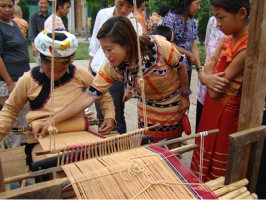 2010年上海世博會(huì)活動(dòng)周期間,一臺(tái)名為《記憶云南》的18項(xiàng)非物質(zhì)文化遺產(chǎn)展示成為最吸引眼球的亮點(diǎn)之一?;顒?dòng)現(xiàn)場(chǎng),18名云南非物質(zhì)文化遺產(chǎn)傳承人和民間藝人展示白族布扎、納西族東巴畫(huà)、傣族剪紙、傣族竹編、佤族織錦技藝等制作技藝。其間展示的佤族織錦技藝在民族文化風(fēng)情濃郁,文化底蘊(yùn)深厚的耿馬縣佤族村寨里流傳甚廣。在耿馬的佤族村寨里,婦女們一般都會(huì)紡線(xiàn)織布,佤族傳統(tǒng)服飾也多用自染自織的土布縫制。此地佤族傳統(tǒng)服飾按地域分為兩大類(lèi)。一類(lèi)是分布在耿馬鎮(zhèn)、四排山鄉(xiāng)的傳統(tǒng)服飾,以女性身著佤族紅色短衣筒裙、男子身著佤族黑衣寬褲為標(biāo)志;一類(lèi)是分布在勐簡(jiǎn)鄉(xiāng)大寨村的“黃衣阿佤”服飾,以女性身著佤族黃衣筒裙、男子身著黃衣寬褲為標(biāo)志。佤族婦女所用的紡線(xiàn)有棉線(xiàn)、麻線(xiàn)兩種。棉主要是草棉,麻主要為苧麻和野生火麻,紡線(xiàn)采用內(nèi)地傳入的有紡錘的紡車(chē)。在耿馬鎮(zhèn)芒國(guó)村芒俄村民小組等佤族聚居村寨,筆者先后目睹了佤族織錦的全過(guò)程。只見(jiàn)紡織 中的佤族婦女一個(gè)個(gè)端坐在紡車(chē)前,凝神專(zhuān)注地操持著手中的活計(jì)。她們左手持麻,右手持紡錘,將紡錘放在大腿上一搓,紡錘轉(zhuǎn)動(dòng)起來(lái)后,把麻纖維慢慢從左手拉出并捻成線(xiàn),紡好一截線(xiàn)便將它繞到小竹棍上。如此這般不停地左右穿梭,又不斷地再搓、再捻,紡出的布匹紋理細(xì)密、結(jié)實(shí)挺拔。耿馬四排山鄉(xiāng)織錦的佤族婦女,大多采用一套竹木制的很原始的腰機(jī),前后上下共有十七個(gè)零件。紡線(xiàn)時(shí),她們將線(xiàn)的一頭栓在婦女腰上,另一頭用木棍穿好,擱在織布處釘在地上的兩根木樁上??棔r(shí)兩頭繃緊,將繞在木棍上的緯線(xiàn)穿到經(jīng)線(xiàn)的中間,然后用抒刀把線(xiàn)打緊。這種織法節(jié)奏雖然慢一些,但織出的布更加厚實(shí)緊繃,適用于紡織粗布和麻袋。在勐簡(jiǎn)鄉(xiāng)大寨村的穿“黃衣”的佤族婦女,用黃土、玉米粉、茶葉、小飯豆、欖樹(shù)皮等7種植物做原料浸染的黃色棉線(xiàn)織錦,使用的有竹木制腰機(jī)和紡錘紡車(chē)兩種。織錦時(shí),只見(jiàn)她們一邊捻線(xiàn),一邊傳遞紡錘。不織時(shí),又把紡錘和抒刀拆下,依然卷起放好。來(lái)自耿馬鎮(zhèn)、四排山鄉(xiāng)、勐簡(jiǎn)鄉(xiāng)的佤族群眾介紹,中華人民共和國(guó)成立后,由于商店里賣(mài)的布料比佤族自織的布料更價(jià)廉物美,佤族人家自己紡織制作服飾的已經(jīng)不多,但是縫制麻布被和麻袋用的麻布,還是多數(shù)來(lái)源于自家紡織,尤其是佤族村寨婦女穿的裙子,也必須是自己織,不然會(huì)被人同族人恥笑為愚笨和懶惰。2009年以來(lái),每年5月中旬,耿馬都要舉辦佤族“青苗節(jié)”慶典活動(dòng)?;顒?dòng)期間,該縣不僅上演豐富多彩的文藝節(jié)目和民間體育比賽項(xiàng)目,還現(xiàn)場(chǎng)展示該縣獨(dú)具特色的佤族織錦技術(shù)??楀\展示中,來(lái)賓增長(zhǎng)了對(duì)佤族傳統(tǒng)手工技藝方面的知識(shí),不少?lài)^(guān)群眾還饒有興趣地一邊詢(xún)問(wèn)織錦者,一邊親自動(dòng)手體驗(yàn)這項(xiàng)古老而傳統(tǒng)的紡織技藝。