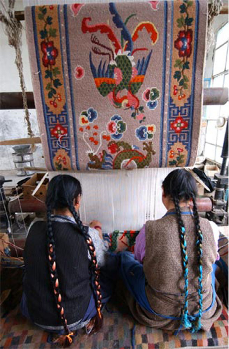 從前,“措巴”每年都要派人去拉薩專為達(dá)賴?yán)锖偷胤秸幙椏▔|以及其他羊毛織品。十三世達(dá)賴?yán)锿恋羌未霑r(shí)期,江孜織工索朗多布杰手藝高超,曾為達(dá)賴?yán)锟椓穗p龍靠墊、凈水瓶袋等著名織品,被封為五品官。民主改革后,江孜卡墊業(yè)在中央政府的關(guān)懷下又有了新的發(fā)展,他們編織的“布達(dá)拉宮”、“珠穆朗瑪”、“萬里長城”等壁毯和地毯,是享譽(yù)國內(nèi)外的精品。