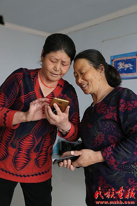 都貴瑪(右)和扎拉嘎木吉在翻看老照片。(新華社記者 鄧華 攝影)