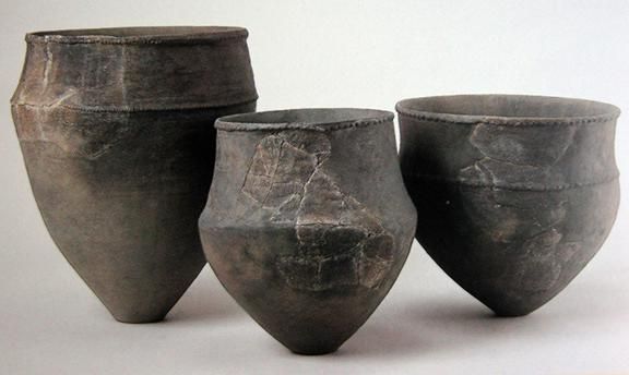 繩文時(shí)代文化中以陶器最為著名,繩文陶器多呈黑褐色和茶褐色,容器較多。器物裝飾繁雜,以厚重華麗為特點(diǎn),與世界其他地區(qū)的陶器均不相同,被認(rèn)為是日本本土產(chǎn)生的一種器型(圖二)。