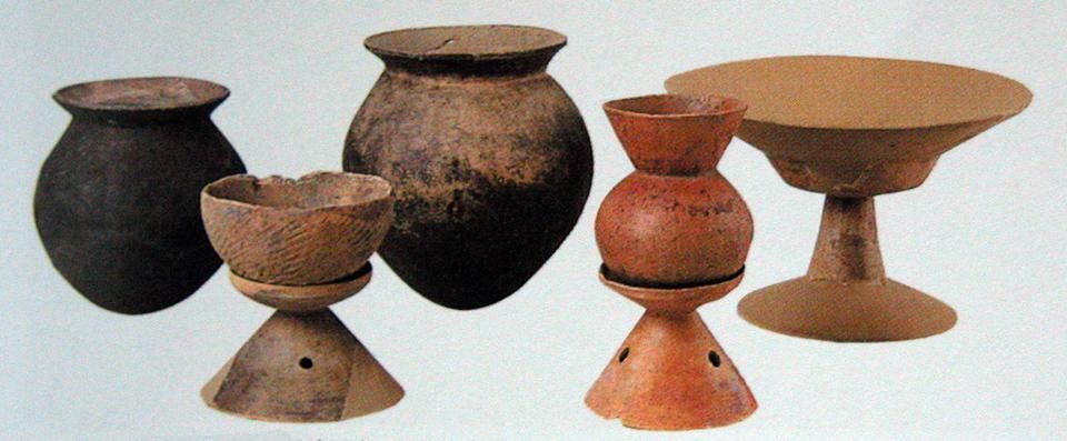 彌生時(shí)代的名稱(chēng),源自1884年?yáng)|京市本鄉(xiāng)彌生町“彌生陶器”的發(fā)現(xiàn)。彌生陶器與繩紋陶器截然不同,為素面,灰色。日本人認(rèn)為彌生陶器是“渡來(lái)人”制造的?!岸蓙?lái)人”是中國(guó)大陸通過(guò)朝鮮半島而來(lái),他們帶來(lái)了陶器的制作技術(shù)。彌生陶器為深釜器,以甕形器、缽形器、高腳杯(豆形器)為主(圖五)。