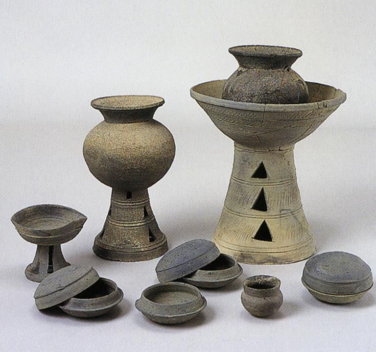 古墳時(shí)期另一種陶器為須惠器(圖十二),比土師器精美。它在古墳時(shí)代中期才從大陸引進(jìn)而來(lái),由朝鮮半島的“陶部”工人在相對(duì)集中的場(chǎng)所制作,采用輪制技術(shù),器物呈青灰色,器形富于變化,主要為壺、瓶、盤(pán)、碗和高腳杯等。