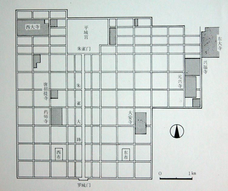 平城京在規(guī)模上繼承了藤原京,面積大致相同,東西約5.9km、南北約4.8km,其形制主要模仿唐長(zhǎng)安城。全城平而呈長(zhǎng)方形,宮城在北部中央。南面正中設(shè)象征性的都城正門(mén)——羅城門(mén)。羅城門(mén)與宮城的朱雀門(mén)相對(duì),朱雀大路縱貫?zāi)媳保L(zhǎng)約3.8km,寬72m。而此朱雀大路正好將全城分為東西兩部分,分別稱(chēng)左京和右京。京城內(nèi)有里坊與商市(即東市和西市)。這些設(shè)置和街道的名稱(chēng)都和唐長(zhǎng)安一模一樣,但總體面積僅為唐長(zhǎng)安城的四分之一(圖二十一)。